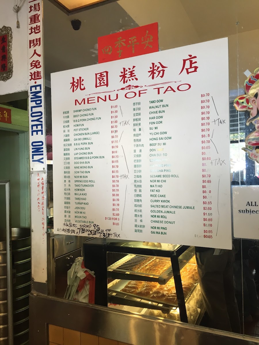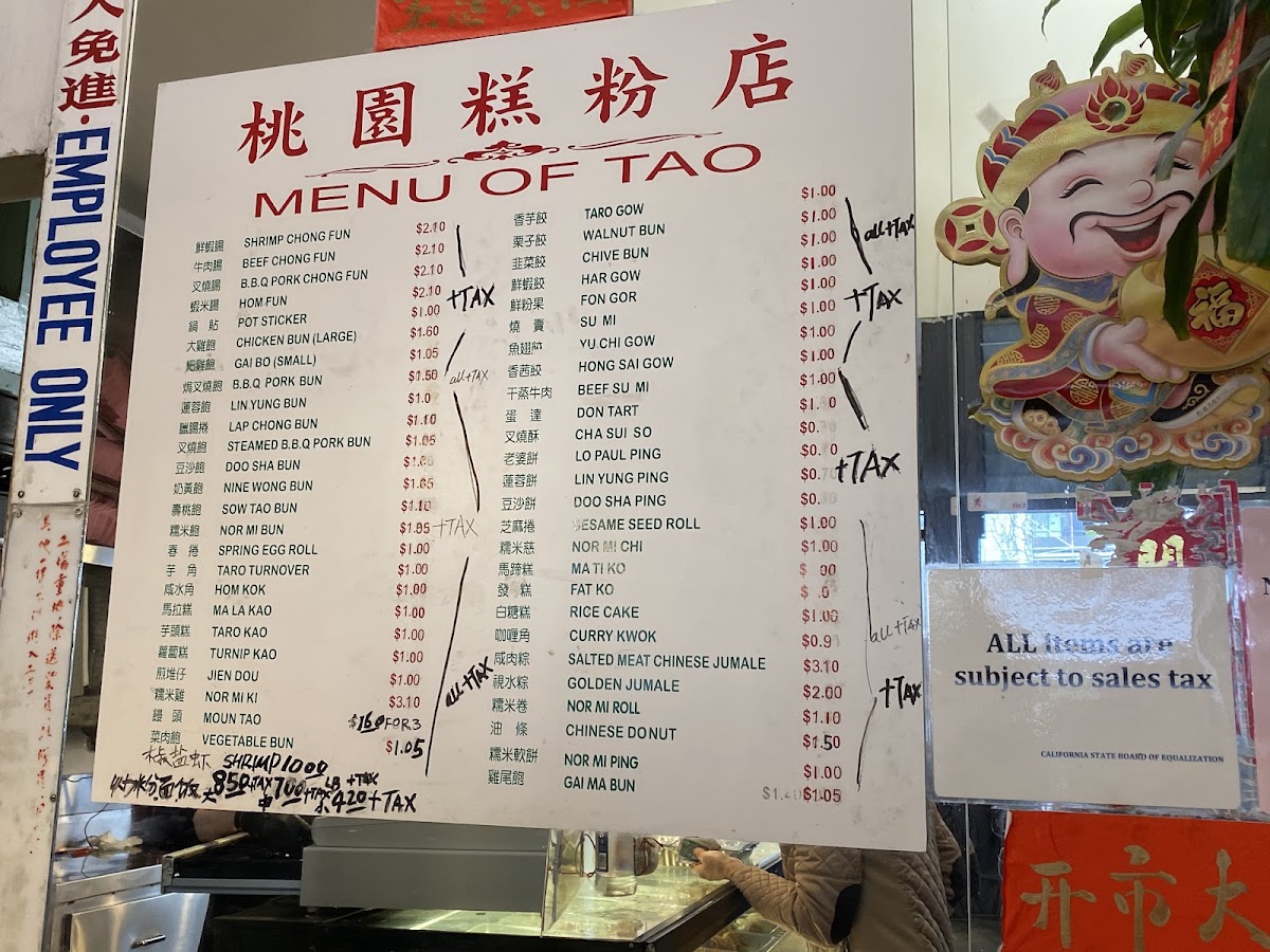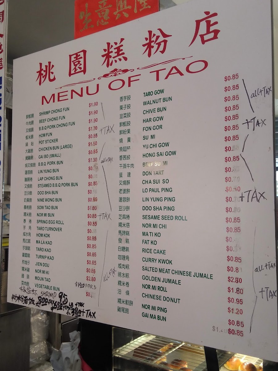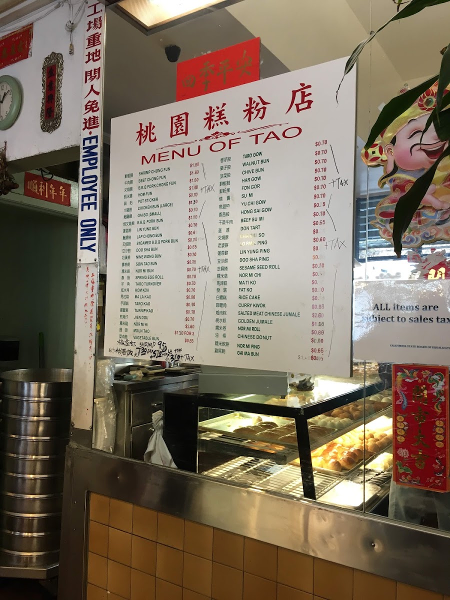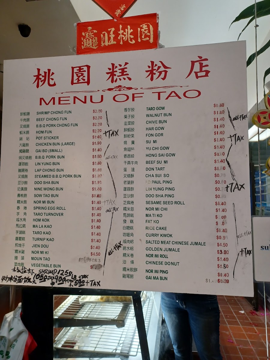 The menu at Tao Yuen Pastry features a range of bakery items and traditional dim sum selections, alongside a variety of Chinese dishes. It is structured to offer a combination of baked goods, steamed buns, noodle dishes, and small plate dim sum suitable for casual dining or quick meals.